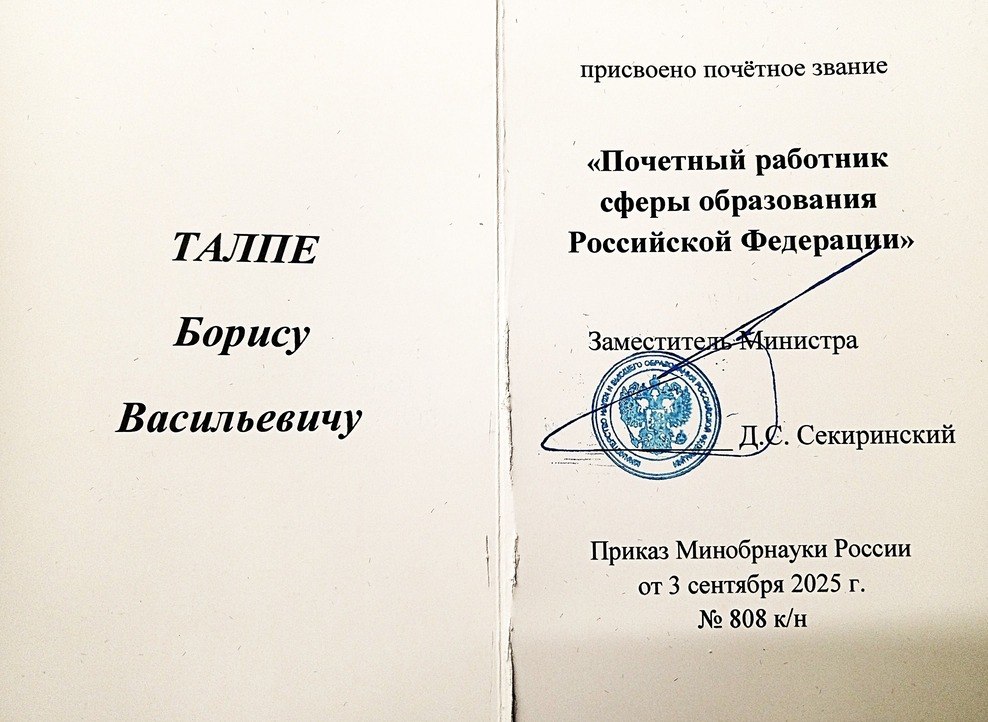 25 декабря в 15:00 в Музее истории Южного федерального университета (г. Ростов-на-Дону, ул. Б. Садовая, 105/42) состоялось торжественное вручение ведомственных наград Министерства науки и высшего образования РФ, Правительства Ростовской области и Администрации города Ростова-на-Дону в рамках празднования 110-летнего юбилея Южного федерального университета. Ведомственные награды вручали Президент ЮФУ Марина Александровна Боровская и Ректор ЮФУ Инна Константиновна Шевченко. Б.В. Талпа -доцент кафедры физической географии, экологии и охраны природы, научный руководитель Научно-Образовательного Центра ИНститута Наук о Земле «Кирпичная Библиотека» награжден нагрудным знаком и ему присвоено почетное звание «Почетный работник сферы образования Российской Федерации» (Приказ Минобрнауки России от 3 сентября 2025 г. №808 к/н).